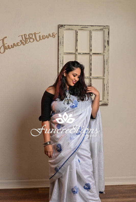 Pure Linen White saree with Zari border and embroidered Peacocks saree