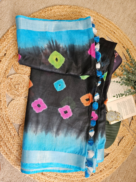 Handwoven organic pure Shibhori printed linen saree black and blue border tassels pallu saree