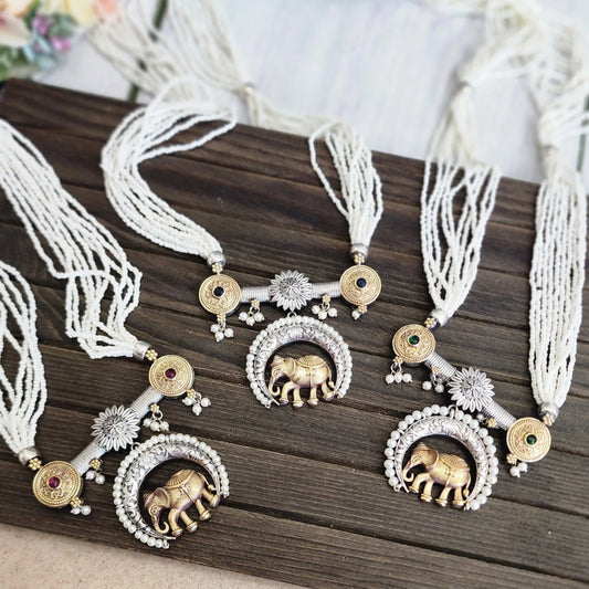 Elephant dualtone long pearl necklace set