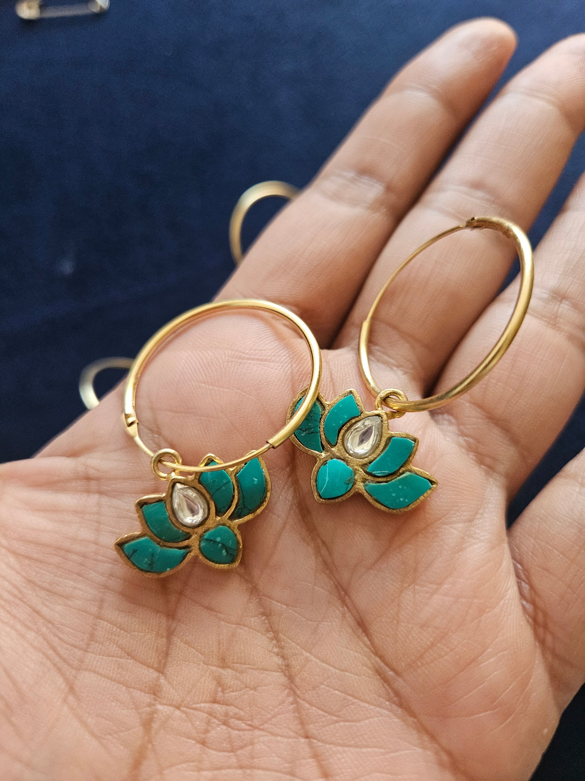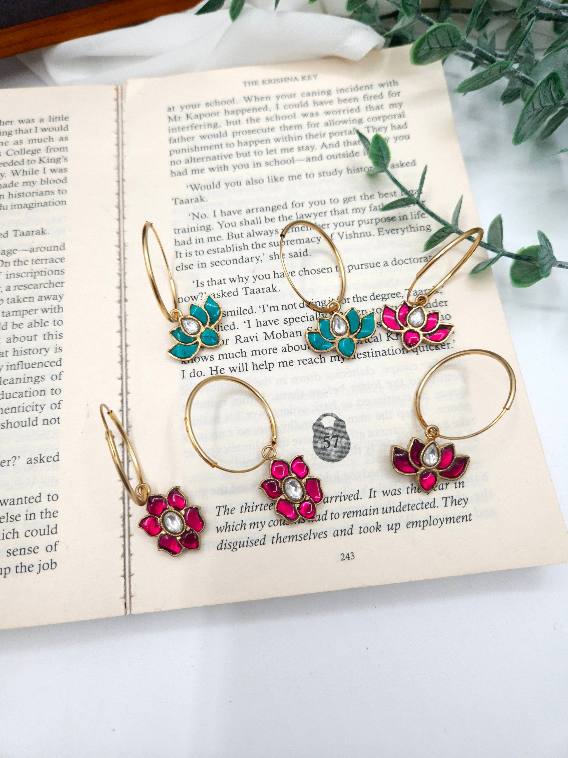 Add a touch of timeless elegance to your jewelry collection with our handcrafted hoop earrings. Featuring intricate floral designs in vibrant red and green enamel, these earrings are adorned with authentic Pachi Kundan stones at the center, exuding charm and sophistication. Lightweight and versatile, they are perfect for both festive occasions and everyday wear. Elevate your style with these exquisite pieces of artistry.