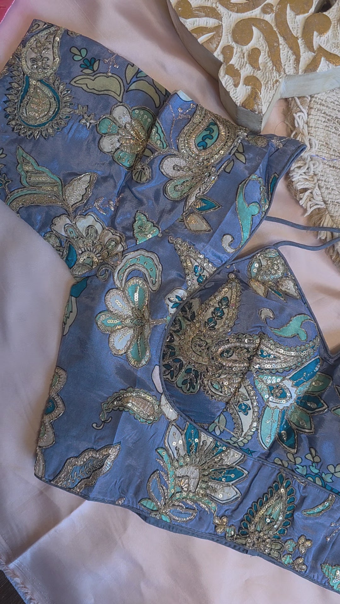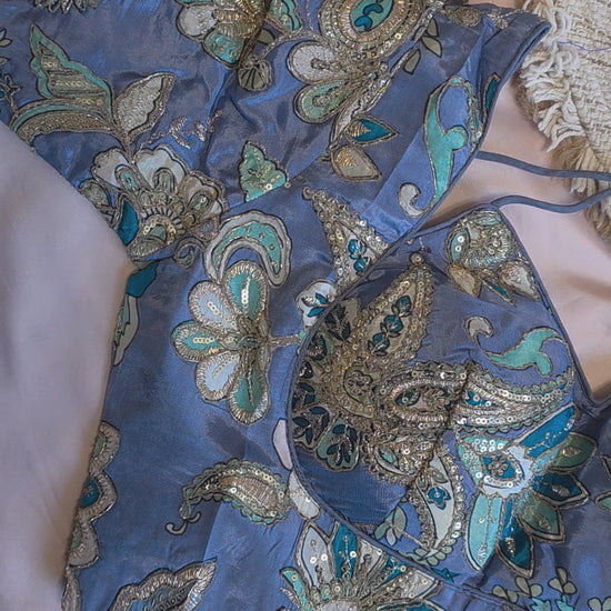 The halter neckline adds a touch of modern sophistication, while the subtle shimmer and smooth texture make it versatile enough to pair with sarees, skirts, or even high-waisted pants.