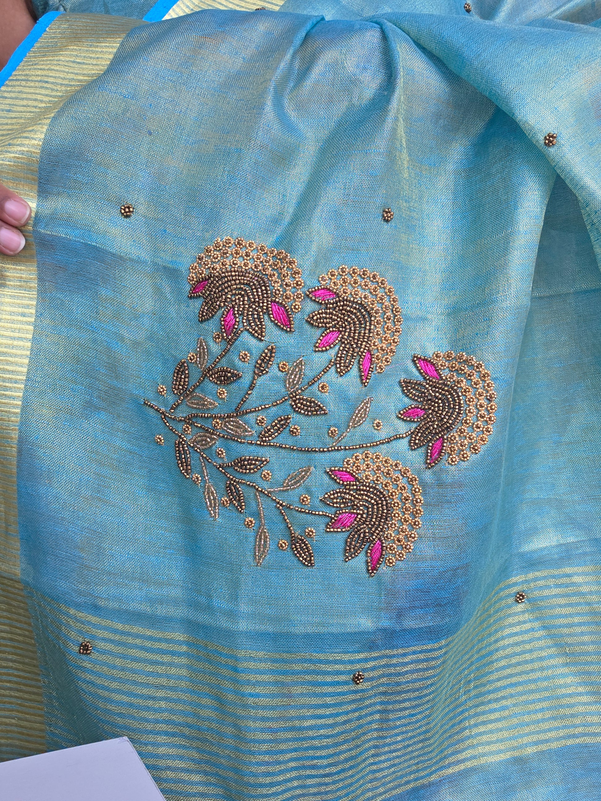 Elevate your festive and special-occasion wardrobe with this stunning royal blue silk tissue saree. Crafted from premium silk tissue fabric, it features a rich sheen, lightweight drape, and a graceful fall that enhances every silhouette. The saree is beautifully finished with an intricate gold lace border, adding the perfect touch of elegance and sophistication.