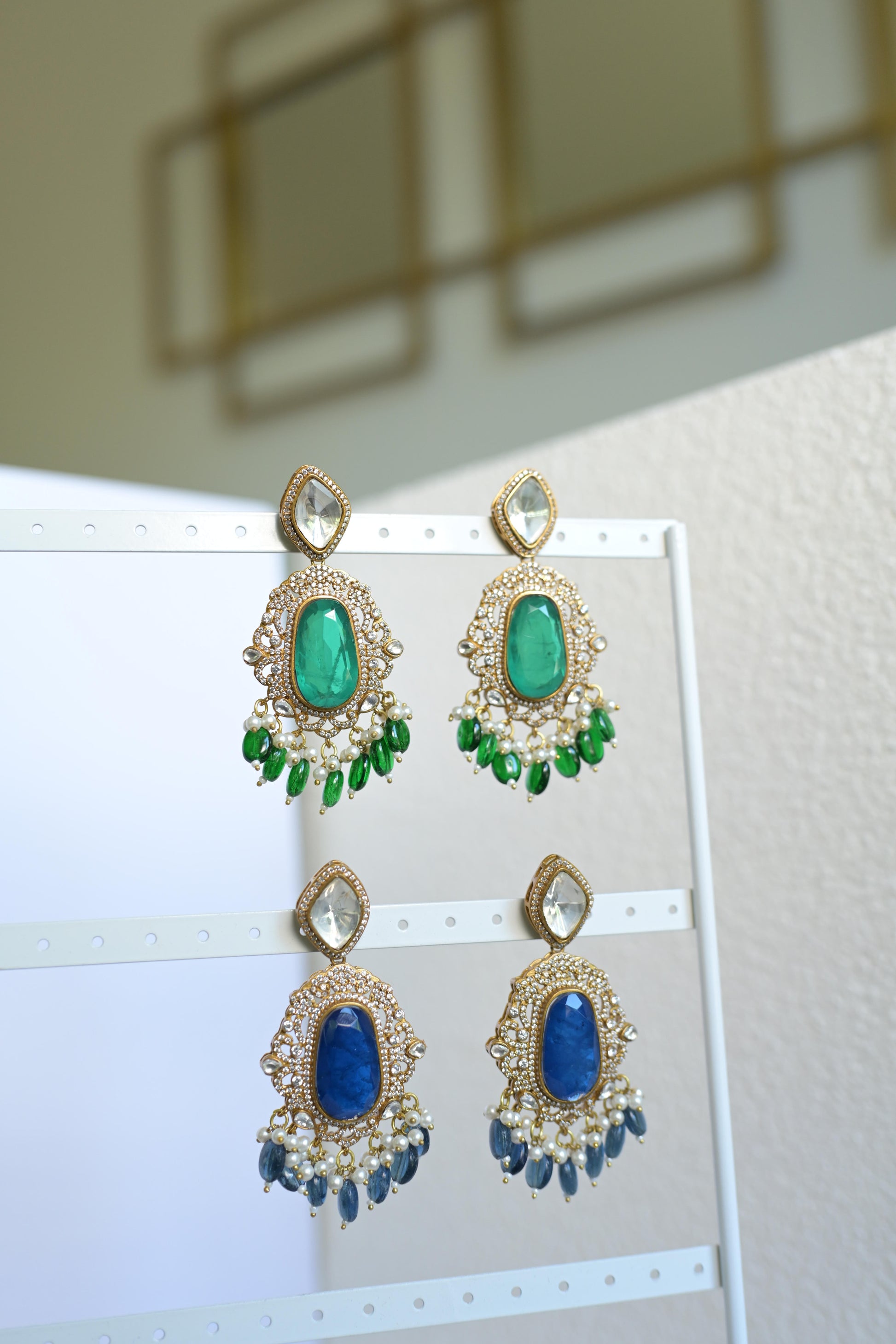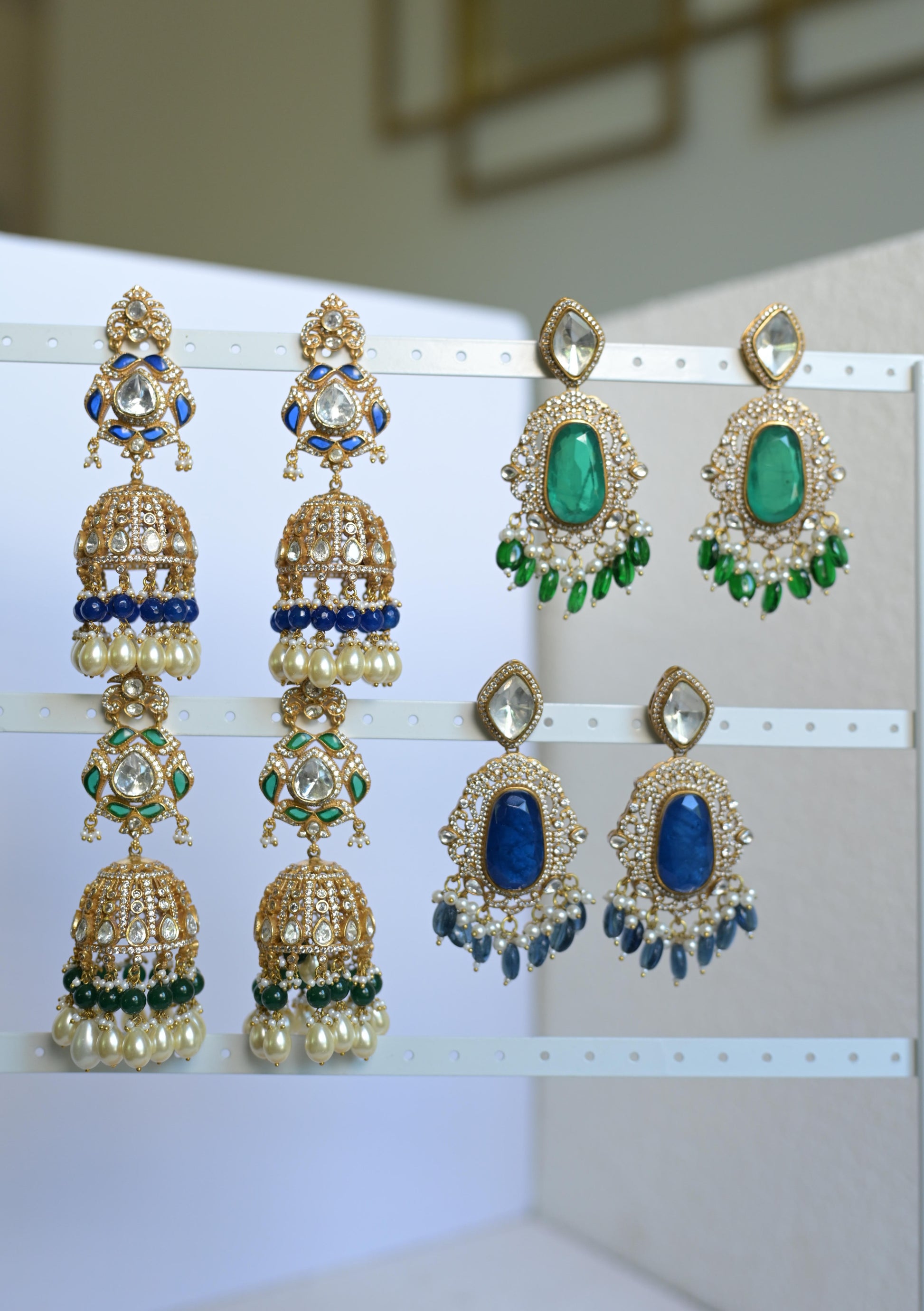 Victorian Moissanite Polki Jhumka Earrings | Royal Blue & Pearl Drop Designer Jewelry