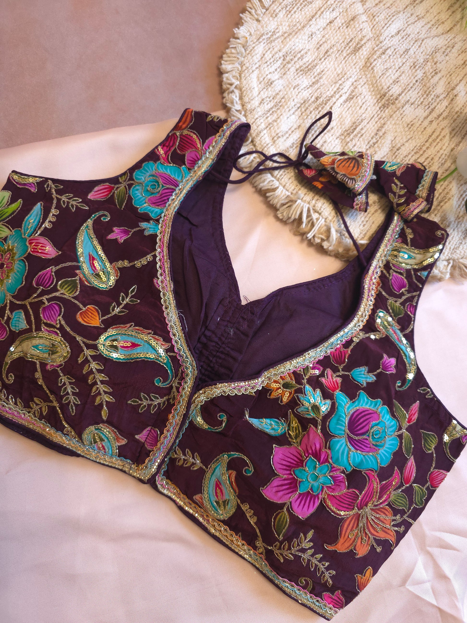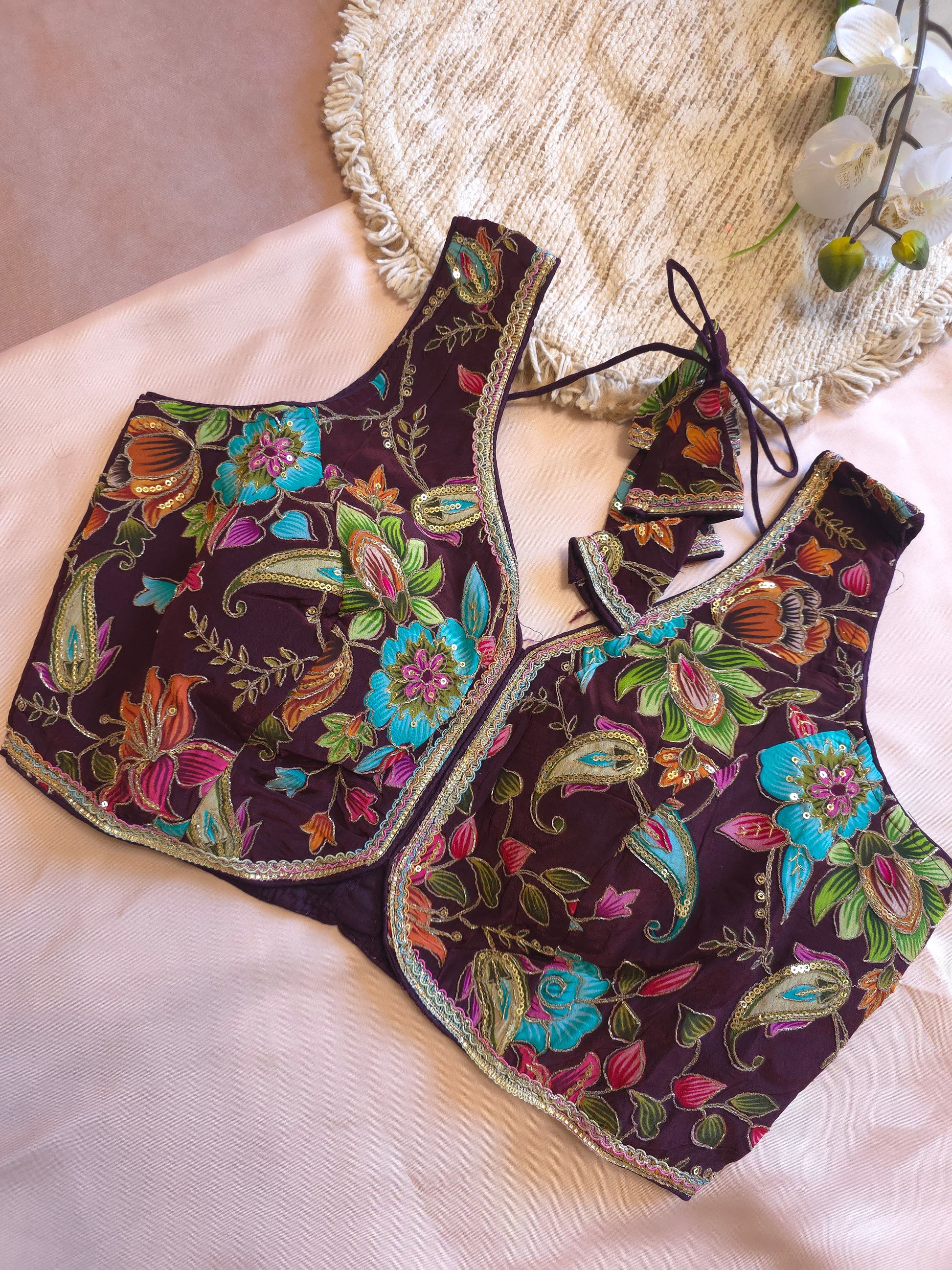 The blouse features vibrant floral and paisley embroidery in multicolor threads with gold detailing — perfect for festivals, weddings, or traditional celebrations. Designed with attachable sleeves, it easily transforms from a sleeveless modern look to a traditional full-sleeve style, making it versatile for any occasion.