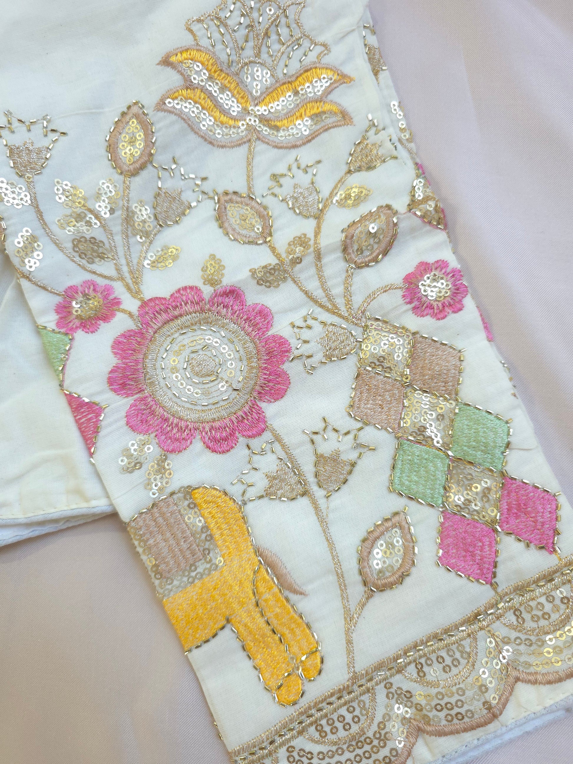 Add elegance and charm to your ethnic look with this stunning ivory hand-embroidered blouse. Crafted in soft cotton fabric, it features vibrant bird and floral embroidery on the sleeves, highlighted with delicate bead and thread work. The intricate design blends traditional artistry with a modern silhouette, making it a perfect match for silk, cotton, or linen sarees.